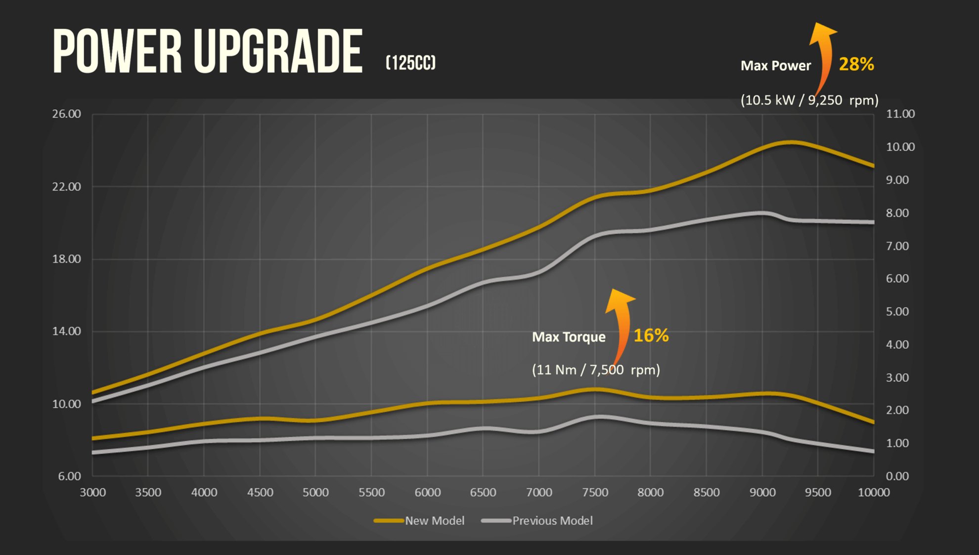 Neuer 125-cm³-flüssigkeitsgekühlter 4-Ventil-Motor Der neu entwickelte flüssigkeitsgekühlter 4-Ventil-Motor bietet exzellente
